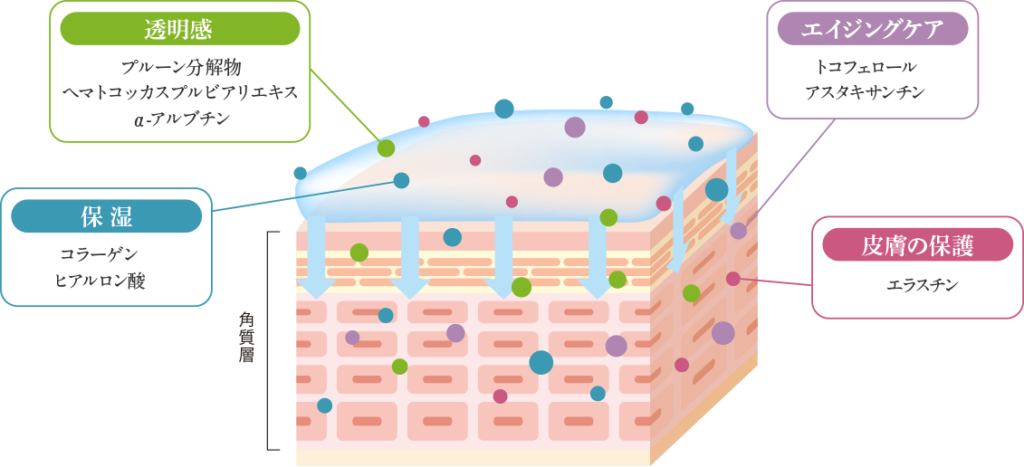アスタキサンチン:キメを整える作用があり、表皮からの水分蒸発を防ぎます。